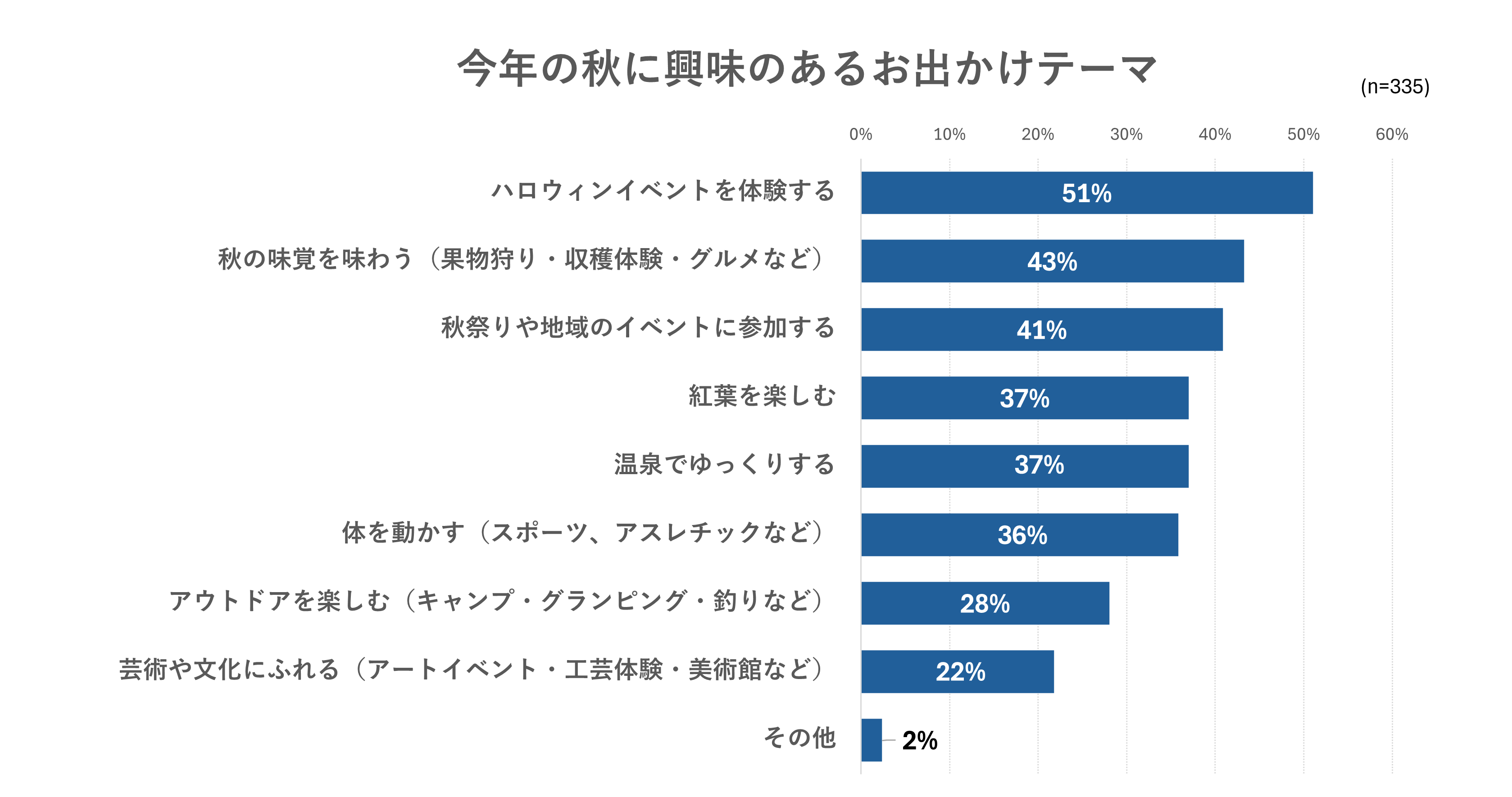 トップは、「ハロウィンイベントを体験する」(51%)でした。ハロウィンは近年、家族で楽しむ行事としてすっかり定着し、秋の恒例イベントとなっています。