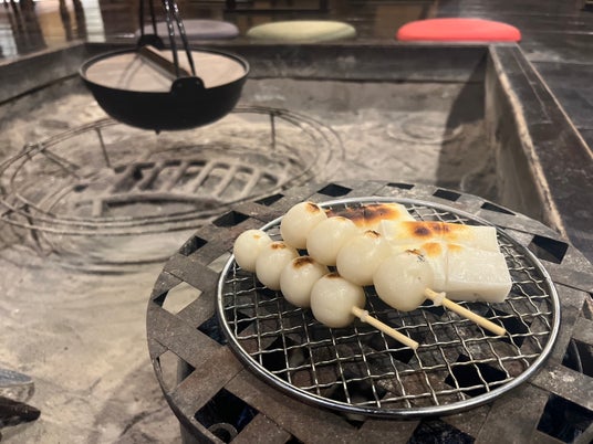 趣のある合掌造りの古民家の中で、お団子を炭火でじっくり焼き、特別なひとときを体験。