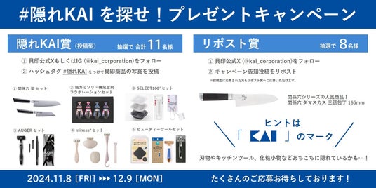 さらに、「いい刃の日」にあわせて11月8日(金)より、貝印公式SNSアカウントをフォローし、ご家庭にある貝印商品の写真を投稿、または公式SNS投稿をシェアすると商品が当たる「『#隠れKAI』を探せ!SNSキャンペーン」も開催いたします。