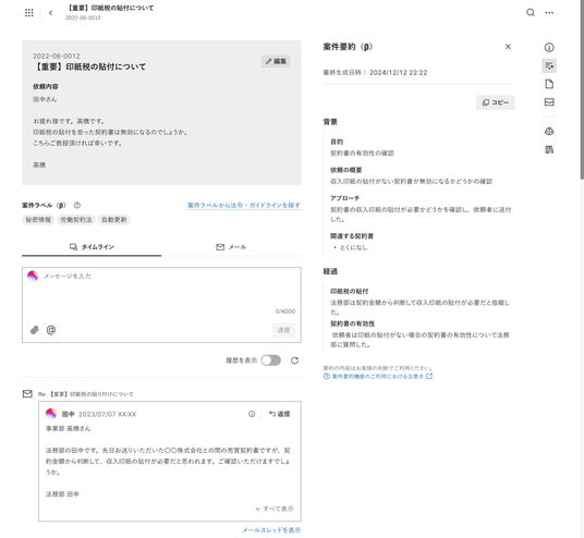 今回、「案件要約機能(β)」が搭載されたことにより、個別の契約案件に関するすべてのやり取りを参照することなく、迅速に案件概要を把握できるようになりました。 これにより、類似案件の参照やトラブル発生時の契約締結経緯の確認、長期にわたってコミュニケーションが生じてる案件の概要把握などを迅速に行うことが可能となります。