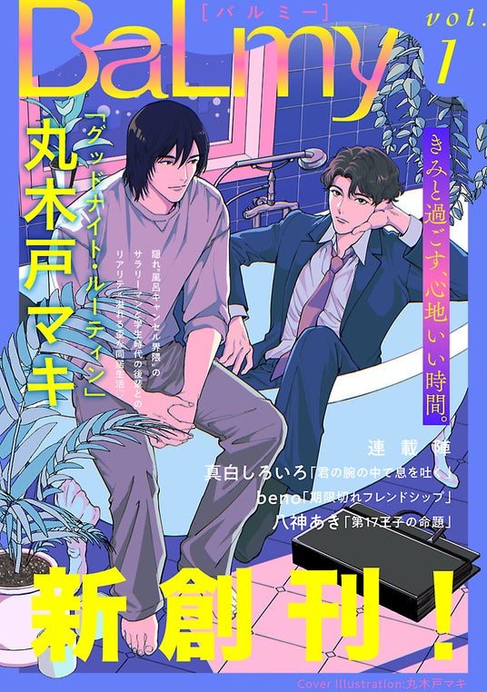 王道・POPな癒やし系BLマガジンBaLmy創刊号のラインナップには、実写化もされた大ヒットBL「ポルノグラファー」の大人気作家・丸木戸マキによる風呂キャンセル界隈BL「グッドナイト・ルーティン」のほか、真白しろいろによる田舎で育む相互救済BL「君の腕の中で息を吐く」、benoによる嘘で始まる幼馴染リーマンBL「期限切れフレンドシップ」、八神あきによる近くて遠い主従の恋を描く「第17王子の命題」の、個性豊かな4作品が集まりました。創刊を記念して、各電子書店では「BaLmy vol.1」の無料キャンペーンを実施いたします。また各作品の単話配信も同時に行われます。