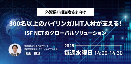 ITインフラソリューションを中心に、クラウド環境やネットワークシステムの構築・保守・運用に関するサービスを提供する株式会社アイエスエフネットは、2025年6月の毎週水曜日に、「300名以上のバイリンガルIT人材が支える ISF NETのグローバルソリューション」セミナーを開催いたします。