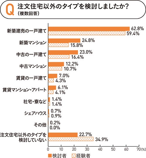 注文住宅以外に検討した住宅タイプについて、検討者・経験者ともに「新築建売の一戸建て」が1位で約6割でした。「新築一戸建て」の中で建売住宅か注文住宅かを検討している人が多いようです。また、「注文住宅以外のタイプを検討していない」は検討者が約2割、経験者が約3割と、注文住宅に一貫している人も一定数いるようです。