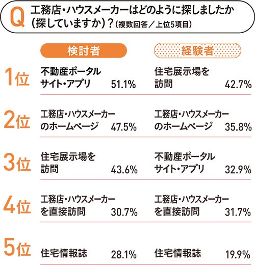 工務店・ハウスメーカーの探し方は検討者の1位が「不動産ポータルサイト・アプリ」で51.1%、経験者の1位が「住宅展示場を訪問」で42.7%でした。