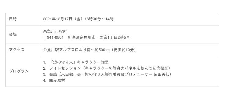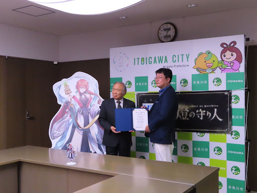 燈の守り人キャラクターを活用して、地域の灯台を歴史・文化資産として活用する機運をつくるため、キャラクター化の対象となる「能生港灯台」が立地している新潟県糸魚川市の米田徹市長を、「燈の守り人」製作委員会プロデューサーの柴田英知が2021年12月17日(金)に表敬訪問し、キャラクターの贈呈式を実施しました。