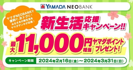 株式会社ヤマダホールディングスのグループ企業である株式会社ヤマダデンキ(本社:群馬県高崎市、代表取締役社長:上野 善紀、以下、ヤマダデンキ)は、提供している銀行サービス「ヤマダNEOBANK」において、2024年2月16日(金)より「新生活応援キャンペーン」を開催いたします。