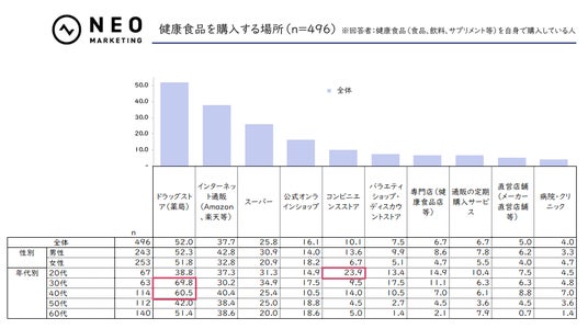 年代別で見ると、20代は「コンビニエンスストア」が23.9%と全体平均の2倍超に。“いつでもどこでも手に入る”手軽さが健康食品購入継続のカギとなっていそうです。