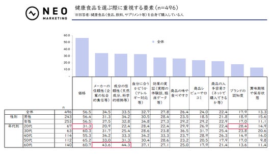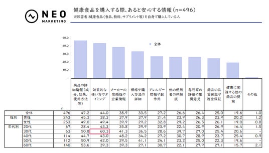 一方、60代は「成分の信頼性(天然成分、科学的根拠等)」「メーカーの信頼性(企業の社会的責任等)」(ともに44%前後)が突出し、科学的根拠と企業への安心感を優先していました。