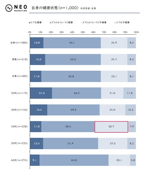 最も不健康感が強いのは40代で、「どちらかというと不健康」が30.7%で年代別最多に。加齢サインの自覚が高まる一方、健康施策が追いついていない構図が浮かびます。
