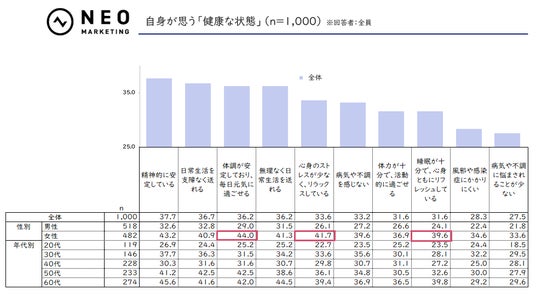 全体で最も多かった回答は「精神的に安定している」(37.7%)と「日常生活を支障なく送れる」(36.7%)で、身体面より“ココロと生活の滑らかさ”を重視する姿勢がうかがえます。