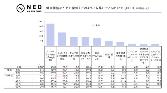 注目すべきなのが、20代でも23.5%が「テレビやラジオの健康番組」を情報源としている点です。
