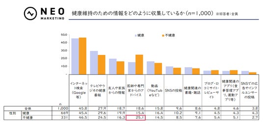また、前掲した設問【自身の健康状態】の回答結果をもとにした“健康実感別”で本設問を見ると、不健康層ほど「医師や専門家からのアドバイス」(25.1%)を頼りにする傾向が明らかに。