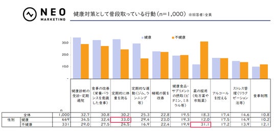 また、前掲した設問【自身の健康状態】の回答結果をもとにした“健康実感別”で本設問を見ると、健康層は「健康診断の受診・定期通院」「定期的に体重を測る」の実施率が高く予防行動が中心。