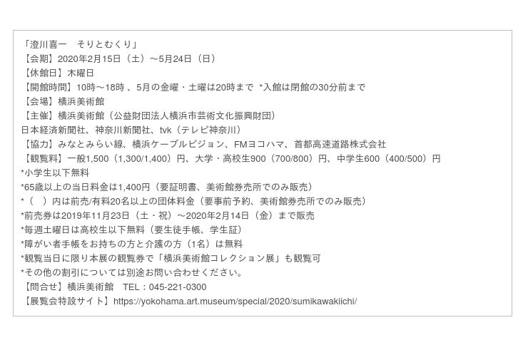塑造による具象彫刻にはじまり、やがて先鋭な木彫の抽象彫刻に転じつつ、巨大な野外彫刻や建築分野との協働へと創作の領域をひろげる澄川喜一の決定版ともいえる展覧会です。