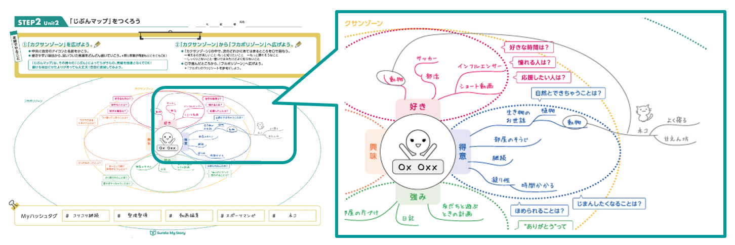「Surala My Story」では、自己分析から問いの設定までを、スモールステップのワークシートと動画で丁寧にガイドします。文章を書くことが苦手な生徒でも取り組みやすいマインドマップ形式のワークを取り入れ、思いついたことを直感的に書き出しながら考えを整理できる設計です。