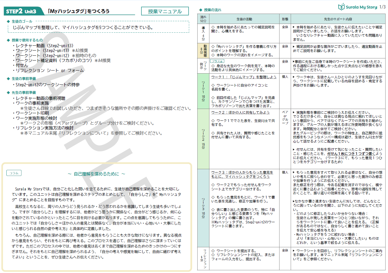 「Surala My Story」では、授業の進行例や声かけのポイントをまとめたマニュアルに加え、情報収集やインタビュー、アンケートの進め方など、探究でつまずきやすい作業を支援する生徒向けガイドを用意しています。