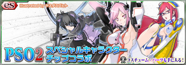 株式会社セガゲームス コンシューマ・オンライン カンパニー(以下、セガゲームス)は、スマートフォン用RPG『ファンタシースターオンライン2 es(以下、PSO2es)』におきまして、本日7月15日(水)よりイラストレーター「ヤスダスズヒト」氏デザインのキャラクターが、チップとなって登場する新スクラッチ「PSO2 スペシャルキャラクター・チップコラボ」を配信します。さらに、スペシャルクエスト<激戦!「天地を貫く剛角」>や、「おまけスクラッチキャンペーン」を開催します。この機会にぜひ『PSO2es』をご体験ください!