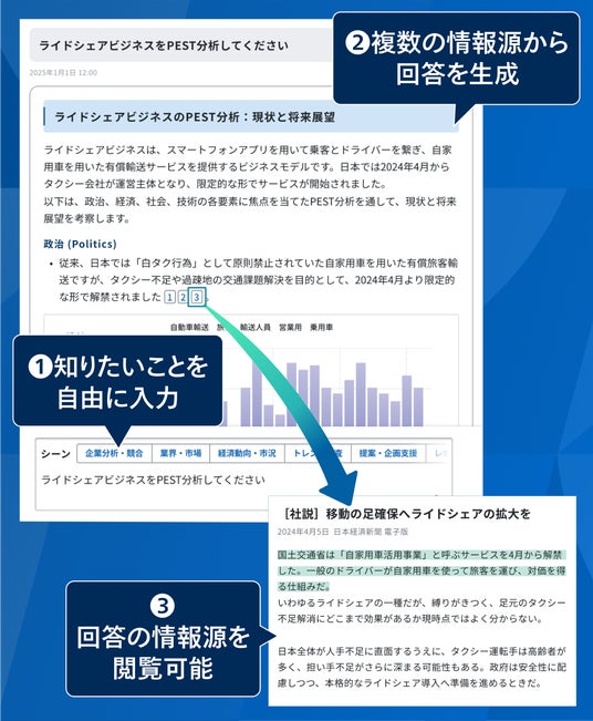 本サービスでは、通常の生成AIが学習していない日経をはじめとするメディア記事や経済データをRAG(検索拡張生成)によって集め、生成AIのテクノロジーを組み合わせることで、情報収集から企画書作成などアウトプットまでのプロセスを劇的に短縮し、AIとの対話形式で簡単にお使いいただけます。主な利用用途としては、企業・業界調査、トレンド分析、先行事例研究などを想定。コンサルタントやリサーチを担当する企画職などプロフェッショナル職の生産性を大幅に向上させます。レポート形式やPEST分析などのフレームワークを活用した様々なアウトプットが可能です。