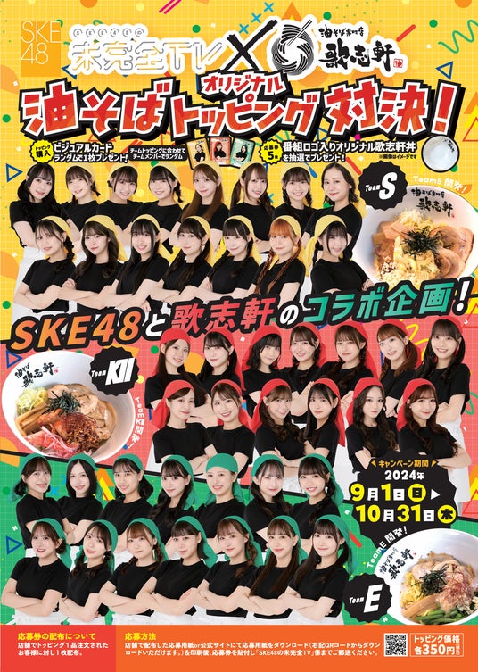 テレビ愛知株式会社は、名古屋・栄を拠点に活躍するアイドルグループSKE48の冠番組「SKE48の未完全TV」と、名古屋に本店を構える「油そば専門店 歌志軒」がコラボした番組オリジナルトッピングを販売いたします。