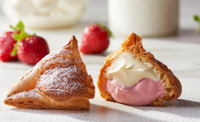 オーブンで焼き上げたサックサクのパイに、マスカルポーネチーズでまろやかに仕上げた北海道産のミルククリームと、いちごをぎゅっと加えた甘酸っぱいストロベリークリームのふたつのクリームを黄金比率で詰め込みました。