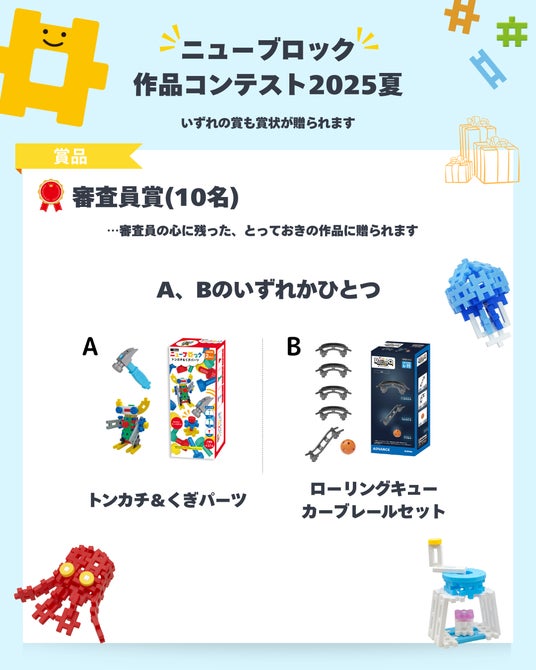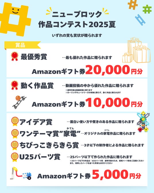 応募作品の中から、『最優秀賞』『動く作品賞』『アイデア賞』『ワンテーマ賞 "家電"』『ちびっこきらきら賞』『U25 パーツ賞』の6つの賞を各1作品ずつ、『審査員賞』を10作品選定し、賞状と賞品を授与します。コンテストの詳細はニューブロック公式サイトの特設ページ(ニューブロック作品コンテスト2025夏)をご覧ください。