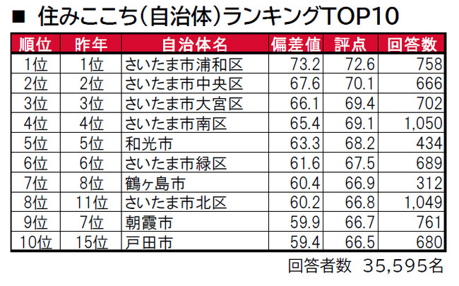 1位は、4年連続でさいたま市浦和区、2位も4年連続でさいたま市中央区です。3位は、2年連続でさいたま市大宮区です。トップ10内では、8位にさいたま市北区(昨年11位)、10位に戸田市(昨年15位)が昨年から順位を上げてランクインしています。