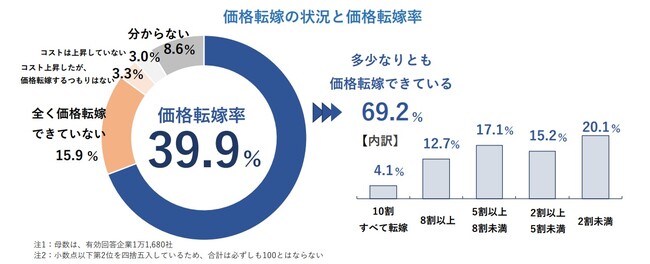 約7割の企業で多少なりとも価格転嫁できているが、価格転嫁率は39.9%で4割に届かず