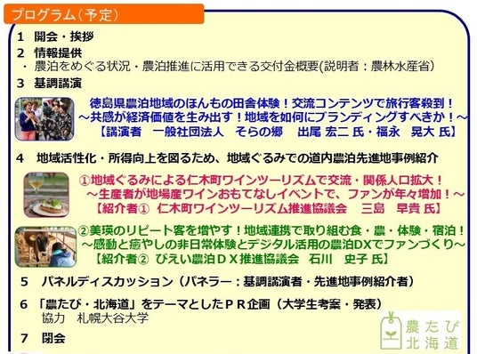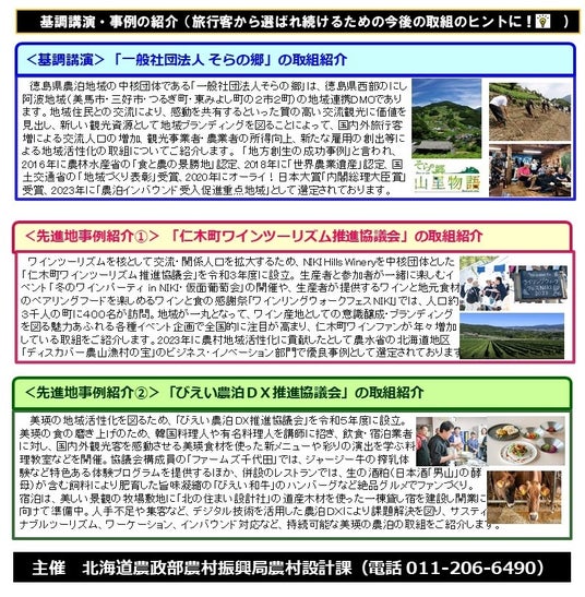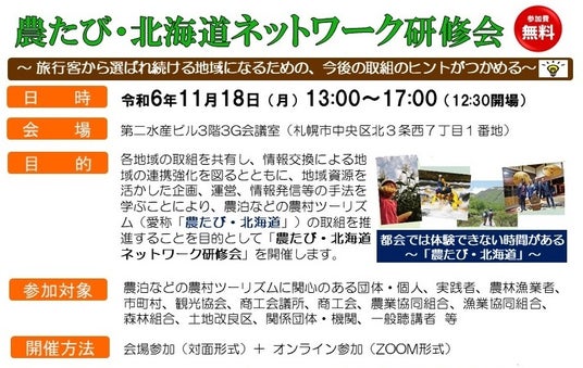 北海道では、農山漁村の豊かな自然や食、歴史・文化などの地域資源を活用した滞在型観光として、地域ぐるみで旅行客を受け入れる農泊などの農村ツーリズム(愛称「農たび・北海道」)の推進を図るため、この度、「農たび・北海道ネットワーク研修会」を開催しますので、お知らせします!