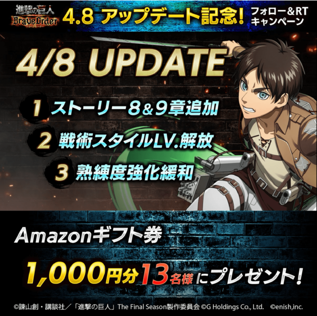 株式会社enish(本社:東京都港区、代表取締役社長:安徳 孝平、以下enish)は、アニメ『進撃の巨人』のスマートフォンゲーム最新作「進撃の巨人Brave Order」にて、本日、新ストーリーとなる8章、9章の追加及び戦術スタイルのLv上限が140まで解放されるアップデートを実施いたしました。新たに追加されたクエストに挑戦し、あなたは生き残ることができるのか!更に、当アップデートを記念してブレオダ公式Twitterにて13名様に1,000円分のAmazonギフト券が当たる!?キャンペーンを実施!最新情報は、ゲーム公式サイト・ゲーム公式Twitterアカウントにて随時公開して行きますので、ぜひご覧ください。