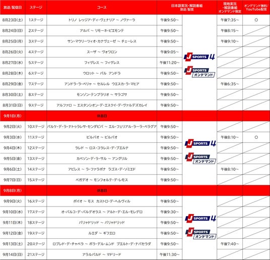 スポーツテレビ局、株式会社ジェイ・スポーツ(本社 東京都江東区、代表取締役社長 長谷 一郎、以下「J SPORTS」 ※1)は 、8月23日(土)に開幕する第80回ブエルタ・ア・エスパーニャの全21ステージ、9月21日(土)に開幕するUCI世界選手権大会 男女エリートタイムトライアル、ロードレースの4レースを今年も独占生中継します。PC、スマホ、タブレットで見られる 「J SPORTSオンデマンド」※2 でも全レースをLIVE配信します。