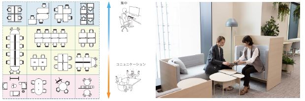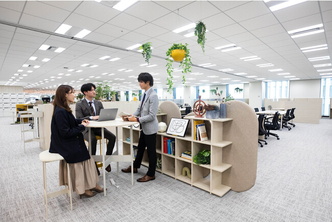 同オフィスは、FSC認証(※1)間伐材を活用した什器や海洋プラスチック再生樹脂を採用したオフィスチェア(※2)を配置し、国や関連機関がCO2の排出量削減量や吸収量をクレジットとして認証する「J-クレジット(※3)」「Jブルークレジット(※4)」の活用により、設置する全ての什器においてカーボン・オフセット(※5)を実現しています。また、多様な働き方に「集中」「リラックス」「コミュニケーション」といった機能を用途に合わせてカスタマイズできるオフィス家具コレクションenKAK(エンカク)を配置しています。これにより、社員のコミュニケーションが活発になり、生産性・快適性が向上し、ポストコロナ時代の新たなオフィス環境を実現できます。
