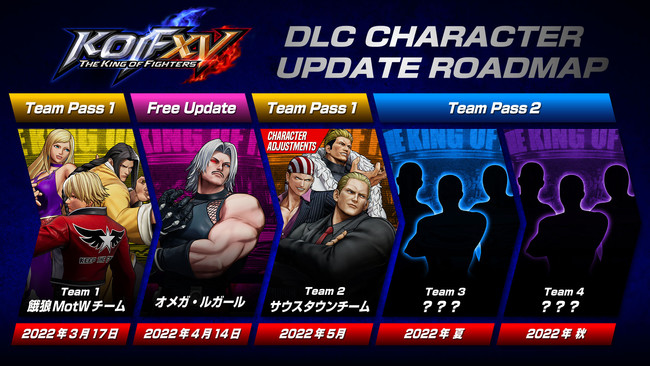 現在配信中の「餓狼MotWチーム(3体)」、4月14日配信の「オメガ・ルガール」に加えて、2022年内にDLCキャラクター9体(3チーム)を配信!計13体のDLCキャラクターとゲーム本編の39体を併せた、総勢52体のファイターが参戦!