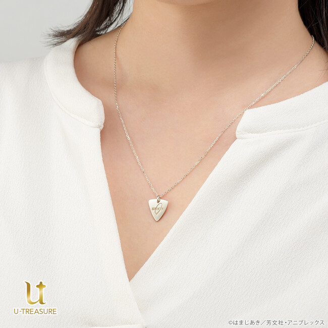 このたびの新作は劇中バンド「結束バンド」のロゴを表面にあしらった、ピック型のネックレスです。裏面にはメンバーと名前を刻印しました。