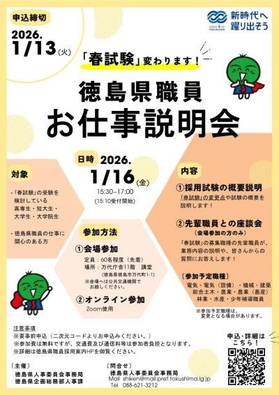 「大学卒業程度(春試験)」の受験を検討している方や徳島県職員の仕事に関心のある方、ご参加をお待ちしています!