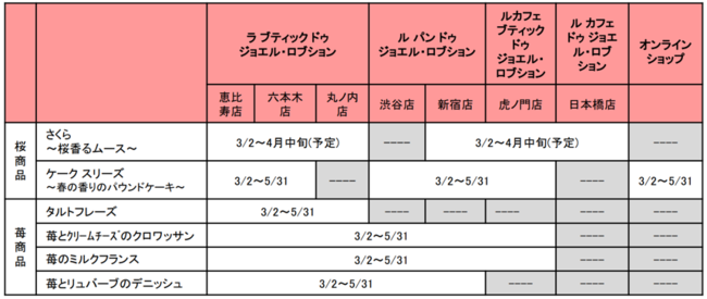 株式会社フォーシーズ(東京都港区南青山 社長:淺野幸子)が運営する「ラ ブティック ドゥ ジョエル・ロブション」(恵比寿ガーデンプレイス店、六本木ヒルズ店、丸の内ブリックスクエア店) 、「ル パン ドゥ ジョエル・ロブション」(渋谷ヒカリエShinQs店、ニュウマン新宿店) 、「ルカフェ ラブティック ドゥ ジョエル・ロブション 虎ノ門ヒルズ店」、公式オンラインショップでは、2022年5月31日(火)までの期間、春らしさいっぱいの桜や苺を使用したスイーツ3種と、パン3種を販売いたします。