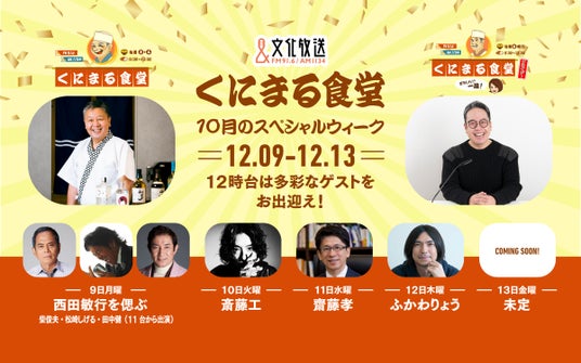 毎日通ってしまう食堂のように、リスナーが気になる情報をお届けしている『くにまる食堂』。スペシャルウィークは、様々なジャンルで活躍する豪華ゲストが続々登場します。