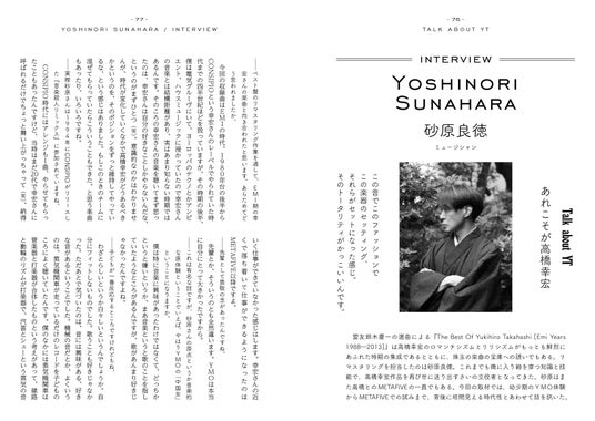 音楽活動、映画などで関わったクリエイターへのインタビュー「TALK ABOUT YT」、ファッションを通じて交流を持った関係者による対談「CROSSTALK ABOUT YT」、活動の変遷に沿って関りを深くしたキーマンたちによる氏への思い、深い洞察が語られています。