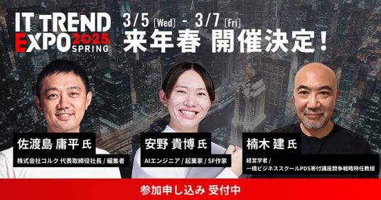 株式会社イノベーション(東証グロース 証券コード3970)のグループ会社である、株式会社Innovation & Co.(本社:東京都渋谷区、代表取締役社長:齊藤和馬、以下「Innovation & Co.」)は、業界最大級のオンライン展示会「ITトレンドEXPO2025 Spring」を、2025年3月5日(水)~ 3月7日(金)を開催します。併せて、内閣府「AI戦略会議」座長 安野 貴博 氏、「競争戦略」の第一人者 楠木 建氏、大ヒット書籍を生み出してきた 佐渡島 庸平氏 の登壇が決定したことをお知らせします。