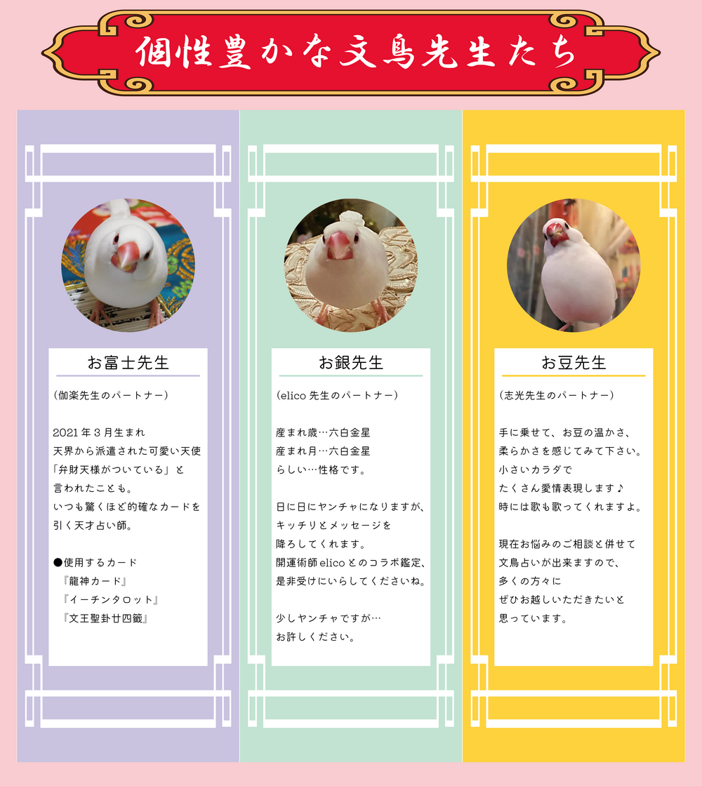 ■ 本物の文鳥が登場する占い 横浜中華街にお店を構える「吉祥天女紅龍店」の出張イベントを開催。本物の「文鳥先生」を3名お招きして1日5名限定で開催します。