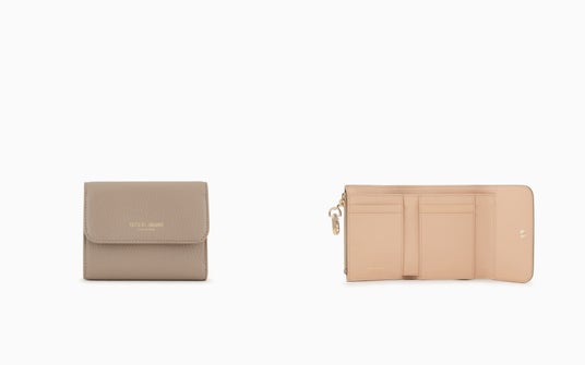 ウィメンズからは、コンパクトなバッグにも収まる機能的なレザーの三つ折りミニウォレットをご紹介します。インサイドにカードを収納できる複数のスロットと、紙幣用コンパートメントを1つ備えています。上品なベージュの地にさりげなくあしらわれたゴールドカラーのロゴがエレガントな印象です。ゴールドカラーのスナップフックのディテール付きで、バッグに取り付けられるのも魅力です。