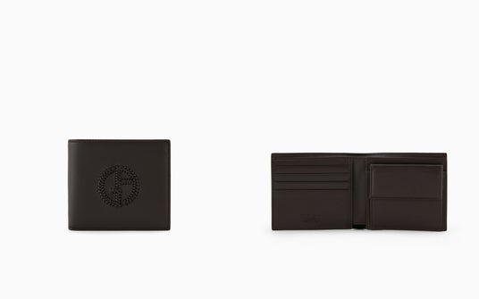 メンズからは、すっきりとしたミニマルなデザインが魅力の、ソフトなレザーを使用した二つ折りウォレットをご紹介します。フロントに施された編み込み風のロゴ刺繍がポイントになっています。インサイドに複数のカードスロット、紙幣用コンパートメント、実用的なフラップ付コインポケットを備え、スナップボタン式の開閉でスマートなライフスタイルにマッチします。