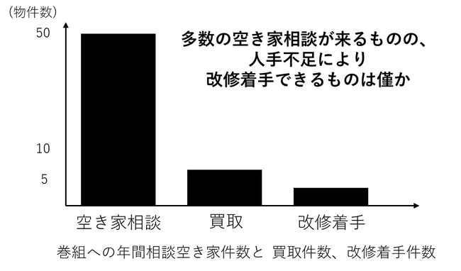 巻組は物件を買い取り、改修しますが、人手不足により、2023年に10件程度を購入した一方で、改修は現状年間5件程度となっています。