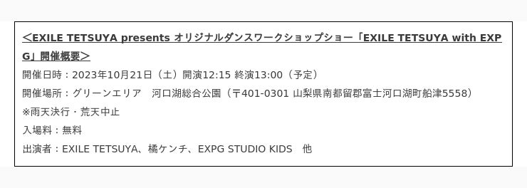 「W TOKYO×LDH JAPAN 地方創生プロジェクト(※)」の第5弾として、山梨初上陸となるEXILE TETSUYAがプロデュースするオリジナルダンスワークショップショー「EXILE TETSUYA with EXPG」が、グリーンエリアにて実施が決定しました。EXILE TETSUYAの他に、EXILE/EXILE THE SECONDの橘ケンチの初参戦も決定!ご来場いただくあらゆる世代の方々と一体となり、LDH所属アーティストの数々の名曲に合わせてダンスを楽しみ、身体を動かしながら、SDGs目標「3.すべての人に健康と福祉を」を推進します。グリーンエリアはどなたでも無料でお楽しみいただけます。是非、ご参加ください!