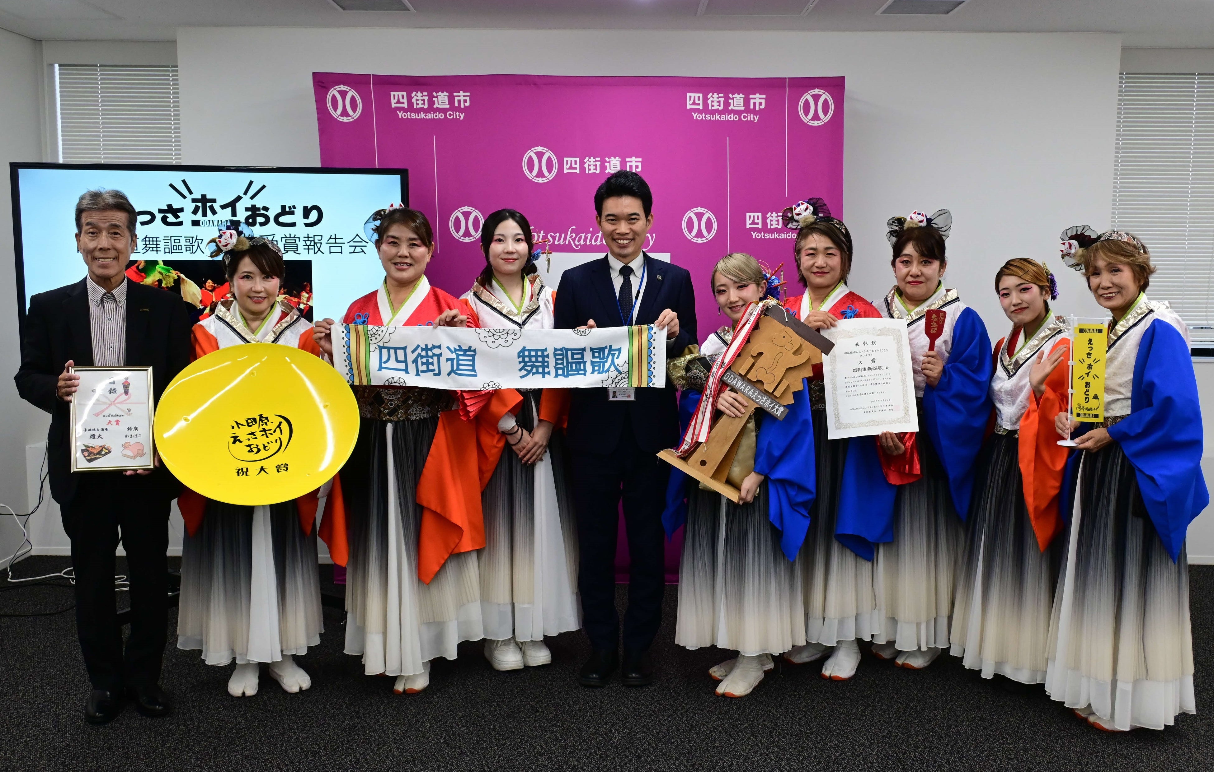 四街道を拠点に活躍するよさこいチーム「四街道舞謳歌」が令和7年9月に神奈川県で開催された「ODAWARAえっさホイおどり2025」に出場し、大賞を受賞したことを報告するため、10月29日(水)に四街道市長を表敬訪問しました。