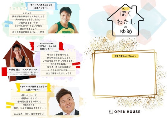 この夢シートは、子どもたちの夢を叶えるきっかけ作りとして「夢を叶えるために今年頑張ること」「なりたい自分・憧れの人」「夢が叶った際の自分へのご褒美」など細かく書いていただくものです。さらに、オープンハウスグループの社員として働きながらパラアスリートとして活躍している小須田潤太選手と、イベントのサポート役として参加されていたサバンナ八木さん・ミサイルマン西代さんからの、子供たちへの応援メッセージも入っています。