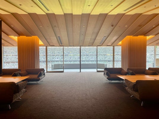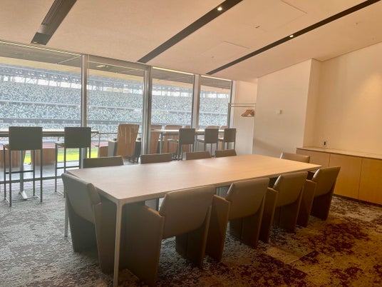 天皇陛下や内閣総理大臣などが懇談や休憩の場所として利用される「プレミアムラウンジ」。椅子や壁の高級感、テラスからの競技場全体の眺めをお楽しみください。今回特別に1,500円/人でお得に利用できる!この日だけVIPになった気分で、特別な1日を!