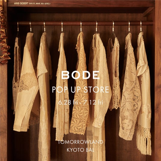 今回のPOP UP STOREでは、トゥモローランド京都BAL店では通常展開のない〈 BODE 〉のアイテムをメンズ、ウィメンズ共にラインアップ。