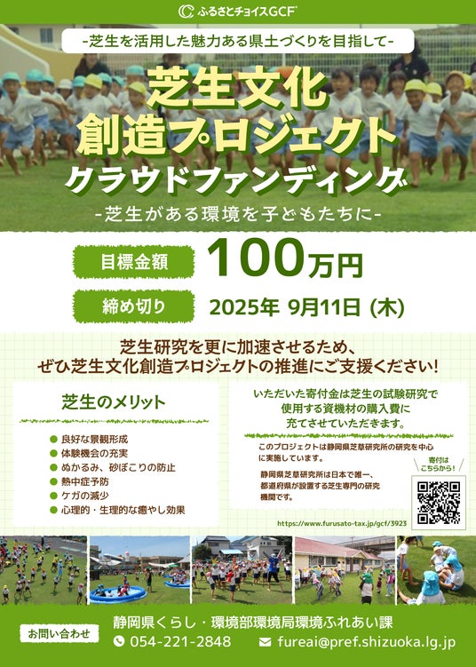 静岡県では、日本で唯一、都道府県が設置する芝生専門の研究機関である静岡県芝草研究所の研究を中心に「芝生文化創造プロジェクト」に取り組んでいます。芝生研究を更に加速させるため、ぜひご支援ください。