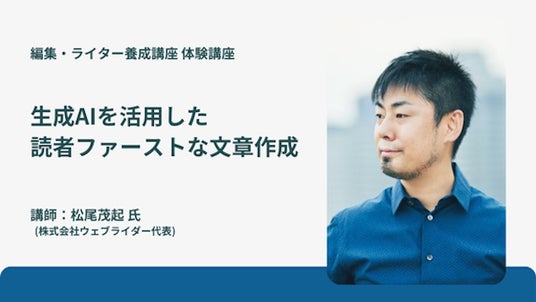 【5月25日(日)10:00~】生成AIを活用した読者ファーストな文章作成株式会社ウェブライダー代表の松尾茂起氏が、「生成AIを活用した読者ファーストな文章作成」をテーマに、ChatGPTの実際の画面もお見せしながら、使い方のコツ・注意点をお伝えします。