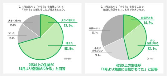 さらに、当初はドリル正答率が50~60%台だった生徒が、同じ単元に繰り返し挑戦することで、最終的に正答率100%を達成するケースも確認されました。アンケート結果では、70%以上の生徒が「4月よりも勉強が分かるようになった」と回答し、46%が「勉強に自信が持てるようになった」と答えています。